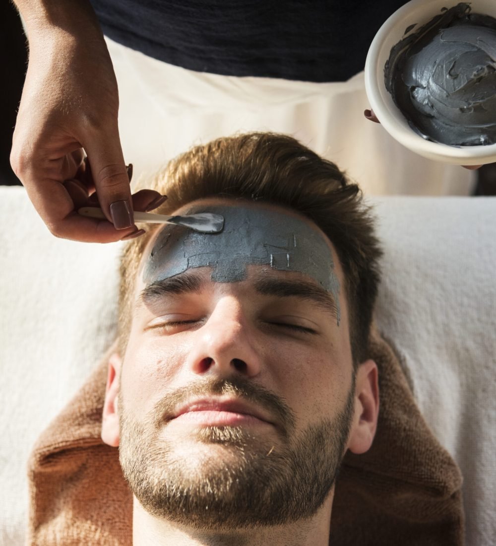 Close-up of man with white facial mask relaxing during treatment at beauty spa.